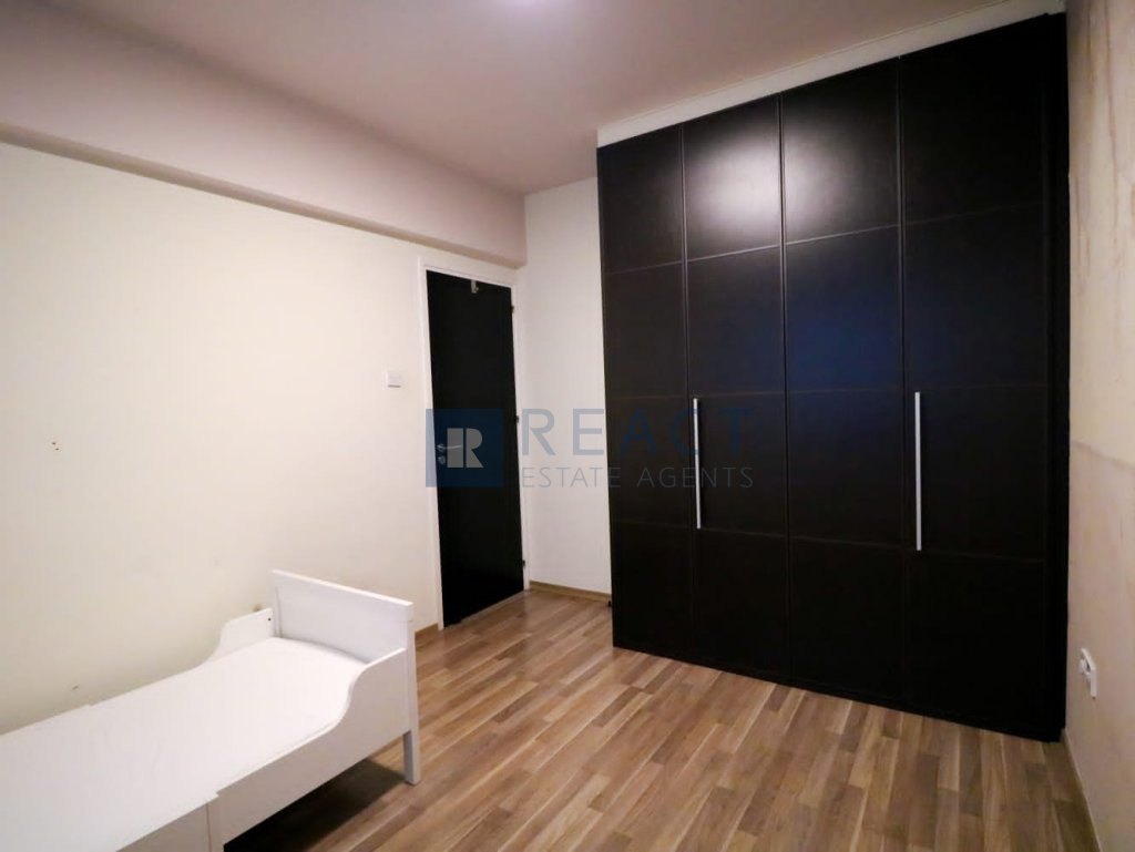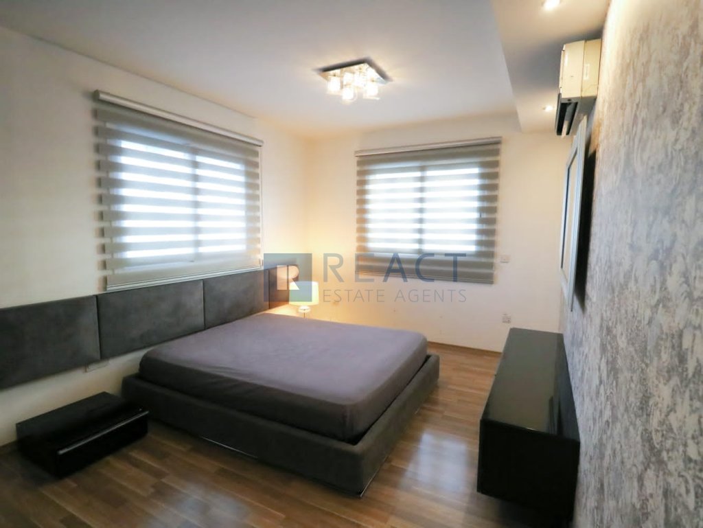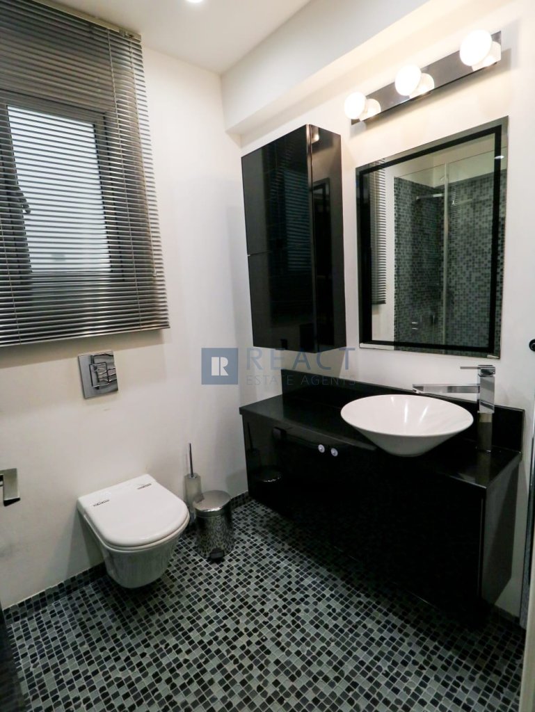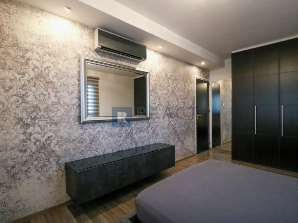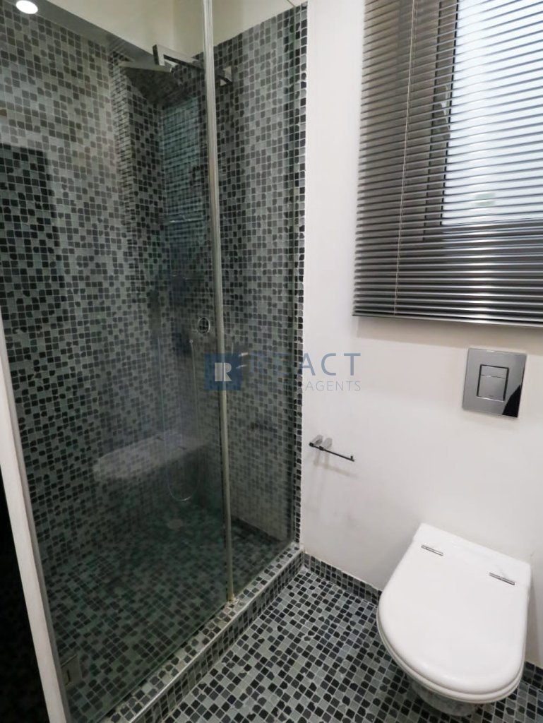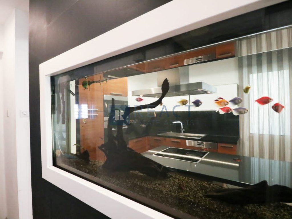 The apartment is located on the top floor of a 3-storey residential building and consists of 2 bedrooms and 2 bathrooms. The open plan kitchen features an integrated aquarium that divides the space and serves as a centerpiece. Bedrooms have exterior aluminum shutters for a blackout effect.