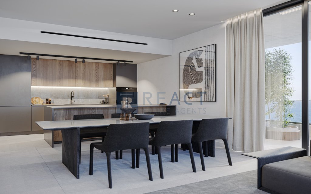 Comprising 2 bedrooms, one of which is en-suite, and 2 bathrooms, the apartment features an open plan kitchen connected to a dining/sitting area. A notable feature is the spacious covered veranda, providing a sea view and located just 50 meters from the sea.