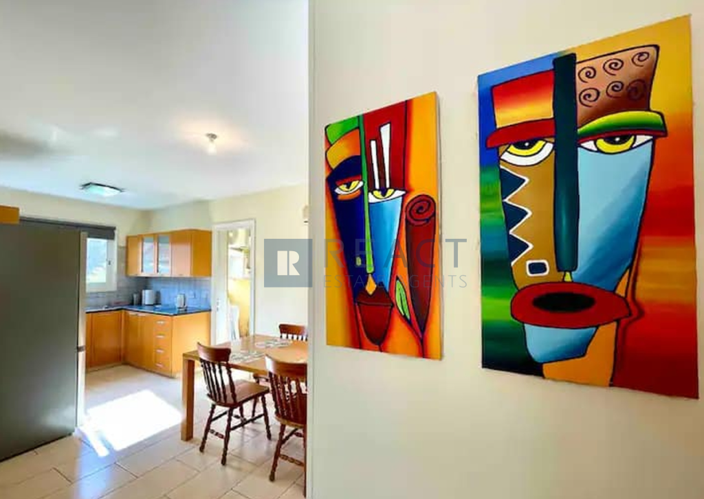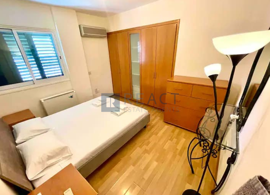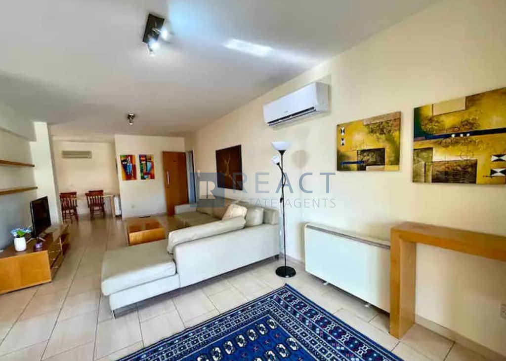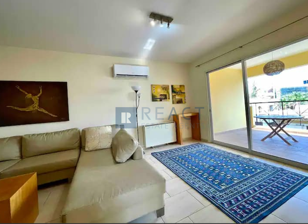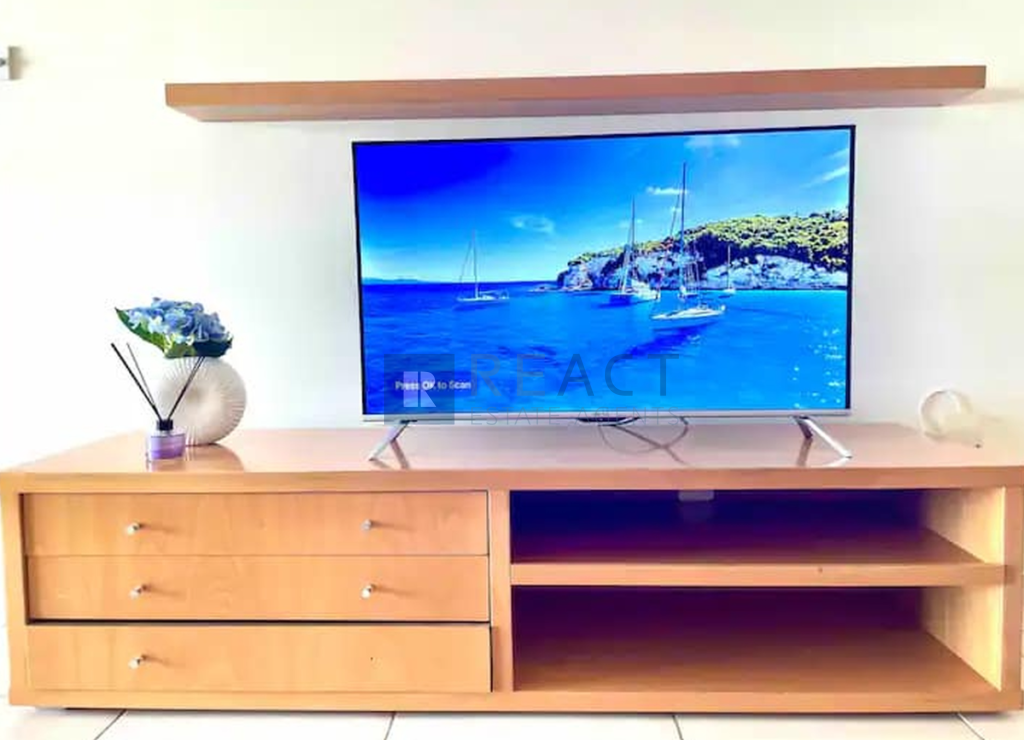 The apartment it's located on the 2nd floor of a 3-storey residential building. It has an internal area of 90sqm with a spacious covered veranda. It consists of 2 bedrooms and one bathroom and an open plan kitchen. The apartment comes fully furnished, private covered parking, and all modern amenities including a 43-inch TV, Internet Wi-Fi, as well as a full eat-in kitchen, with a new complete set of utensils and kitchen appliances.