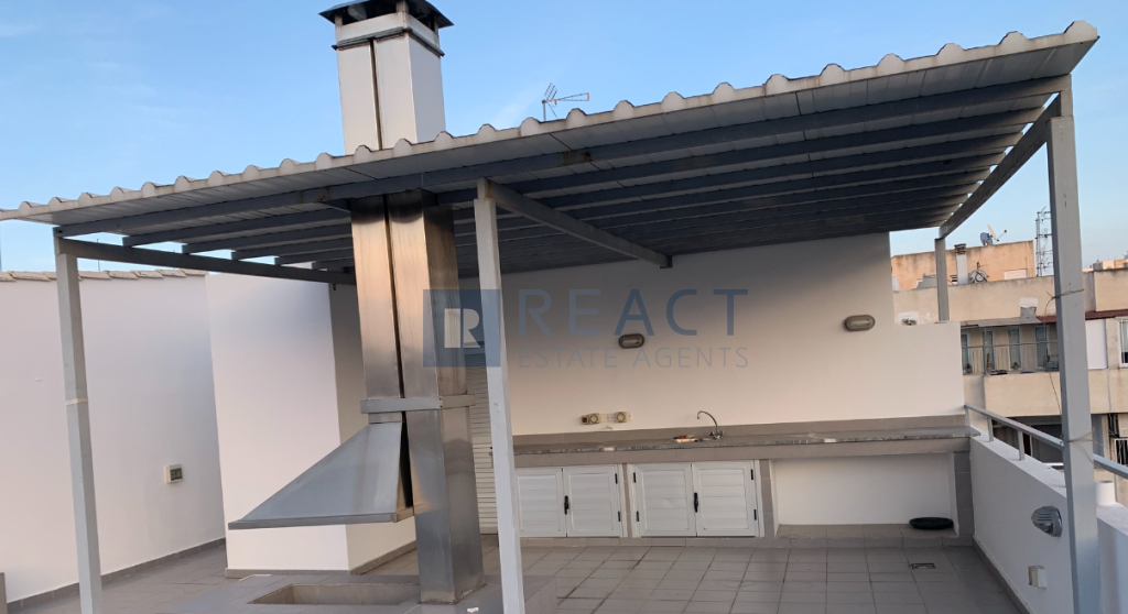 It has an internet area of 110sqm, 30sqm covered verandas and a roof garden 70sqm Open plan modern kitchen with dining/living room area with fireplace, joined to balcony where access to roof garden exists through a cyclical staircase. All the electrical appliances, 2 covered parkings and a storage room.