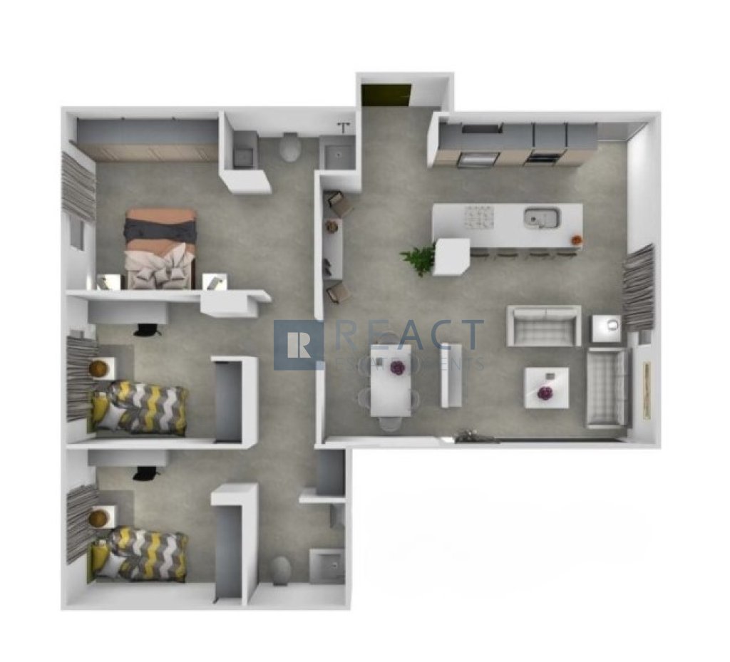 It has 3 bedrooms one of which is en-suite, 3 bathrooms. An open plan kitchen with dinning/living room. The property enjoys a storage room and a covered parking.