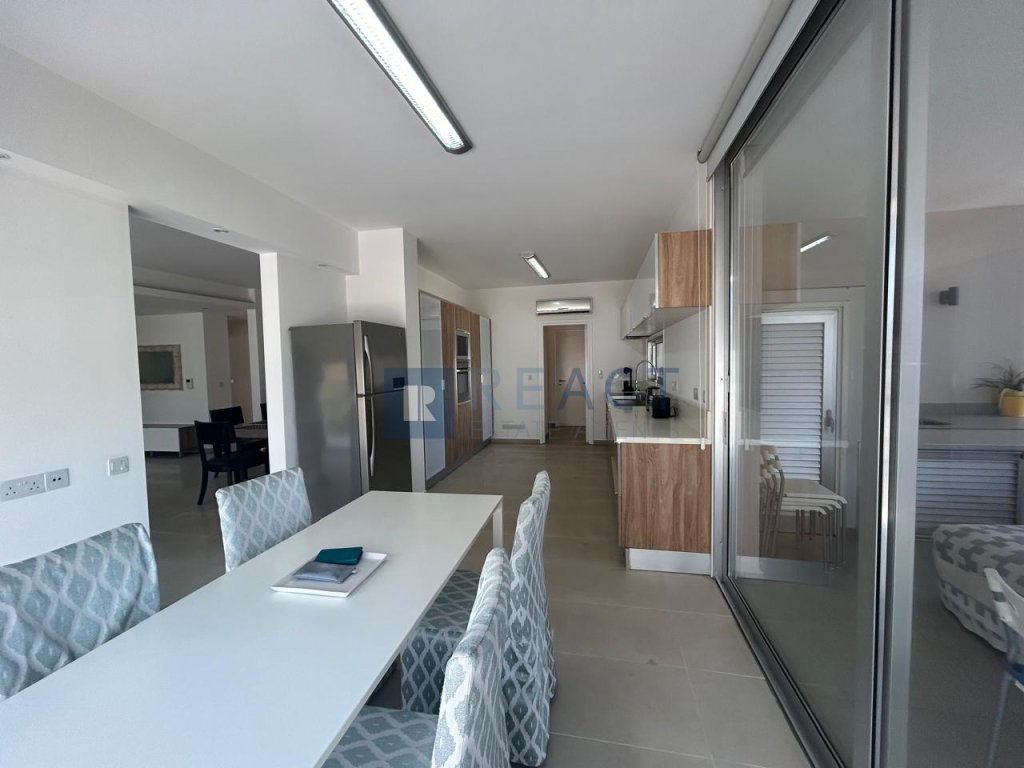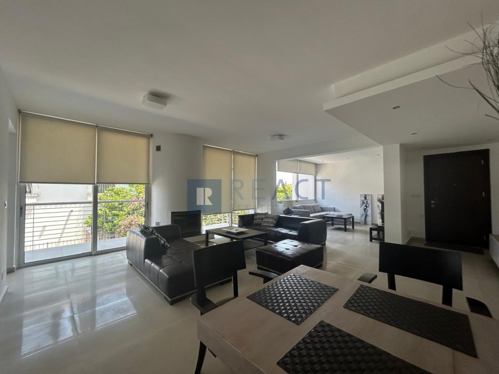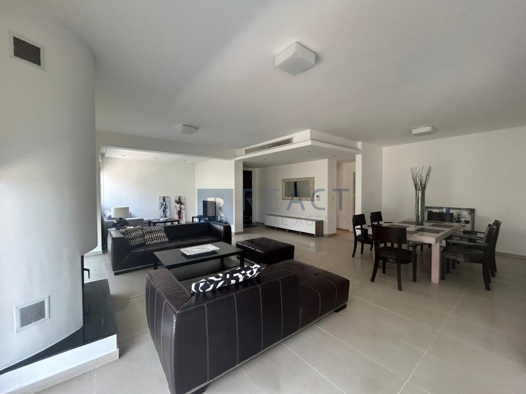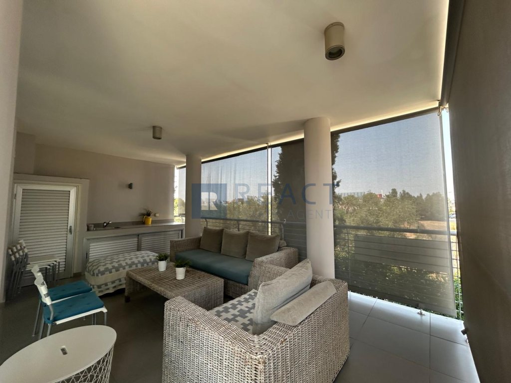 The property is a spacious apartment located on the first floor of a small residential building, featuring an internal area of 180 square meters and 40 square meters of covered verandas. It consists of three bedrooms, all of which are en-suite, along with a guest toilet. The well-sized living and dining area benefits from a fireplace. The apartment is fully furnished and ready to move in. Additionally, it includes three covered parking spaces, a storage room, and an extra room on the ground floor.
