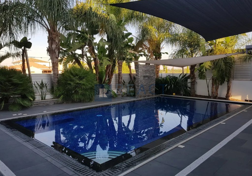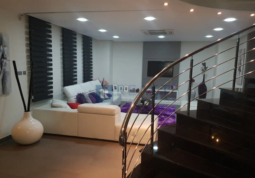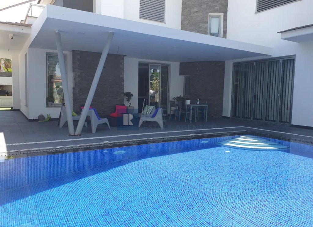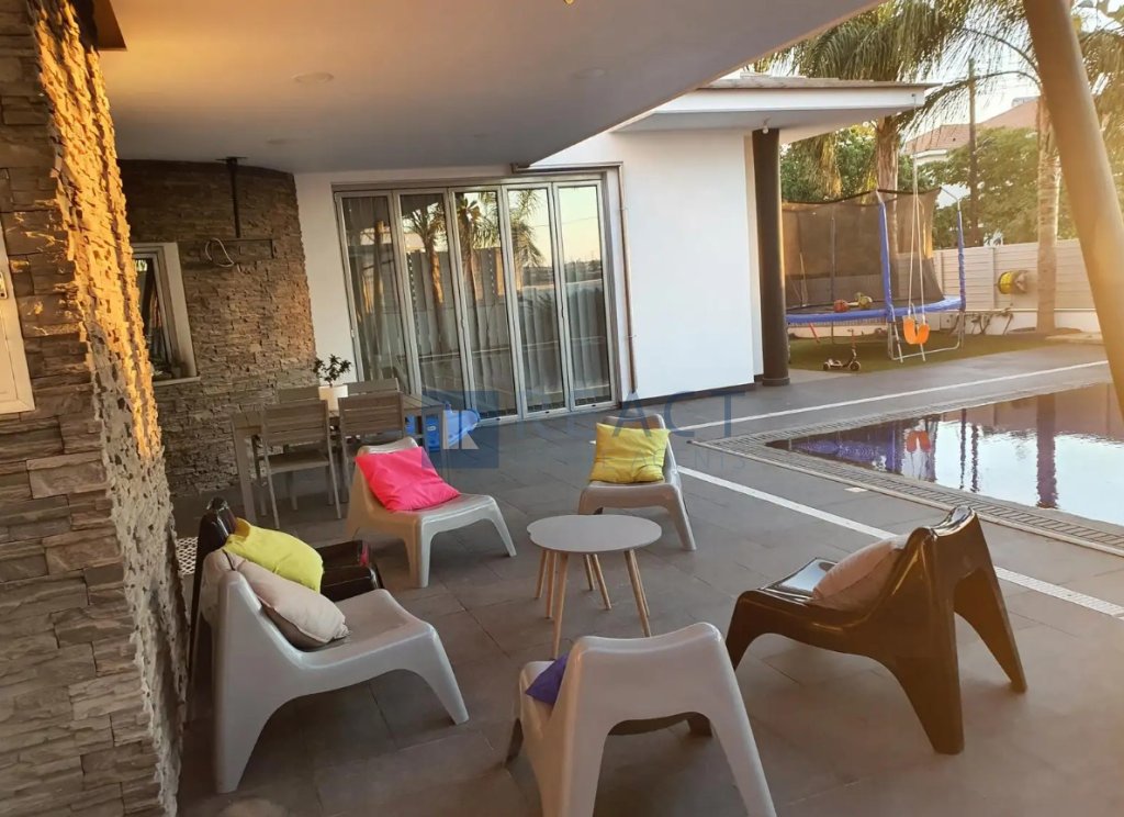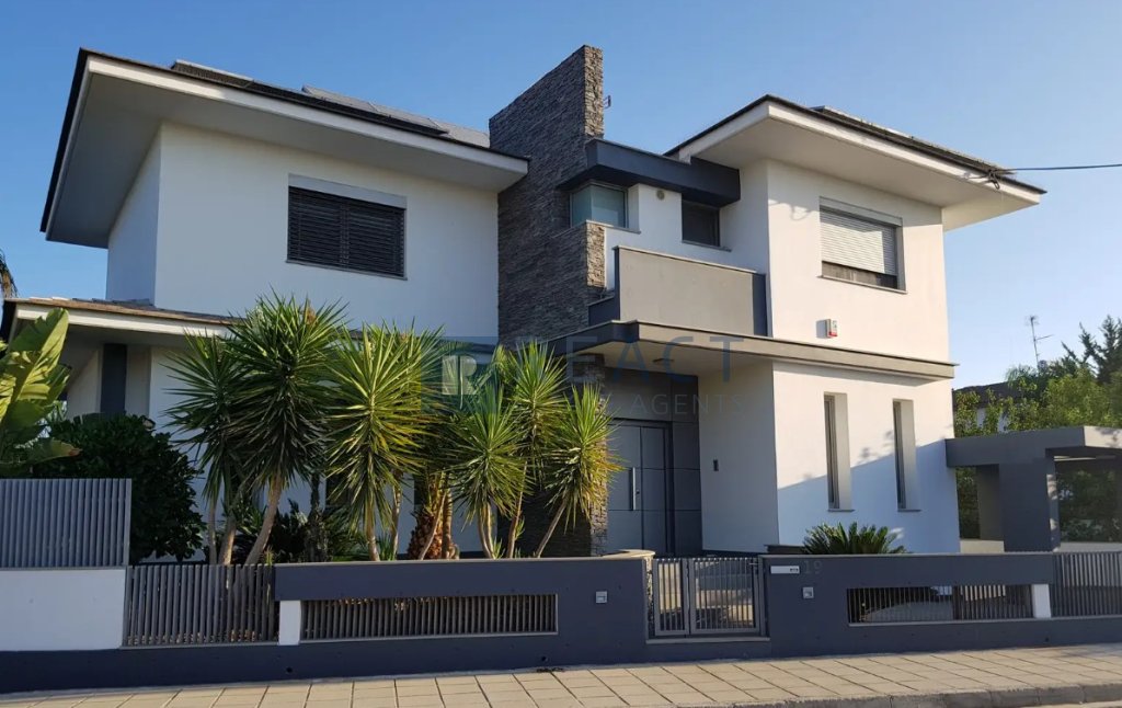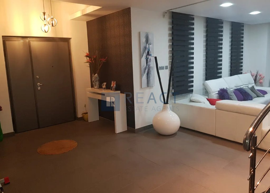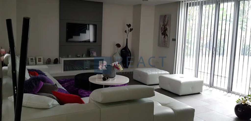 The property has an internal area of 330 sqm built in a corner plot of 555sqm, with the right to use the adjoining plot with an area of 435sqm. The ground level consists of an open plan kitchen with a spacious living room leading to the outdoor area, one office area. The property benefits from a photovoltaic system, 9m x 5m overflow swimming pool. Furthermore the underground area accommodates 4 cars plus a playroom area of 50sqm. The property is fully furnished.