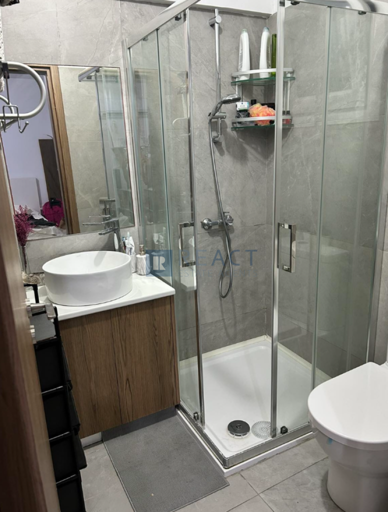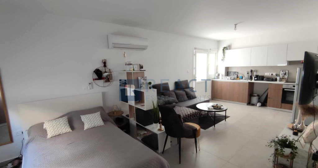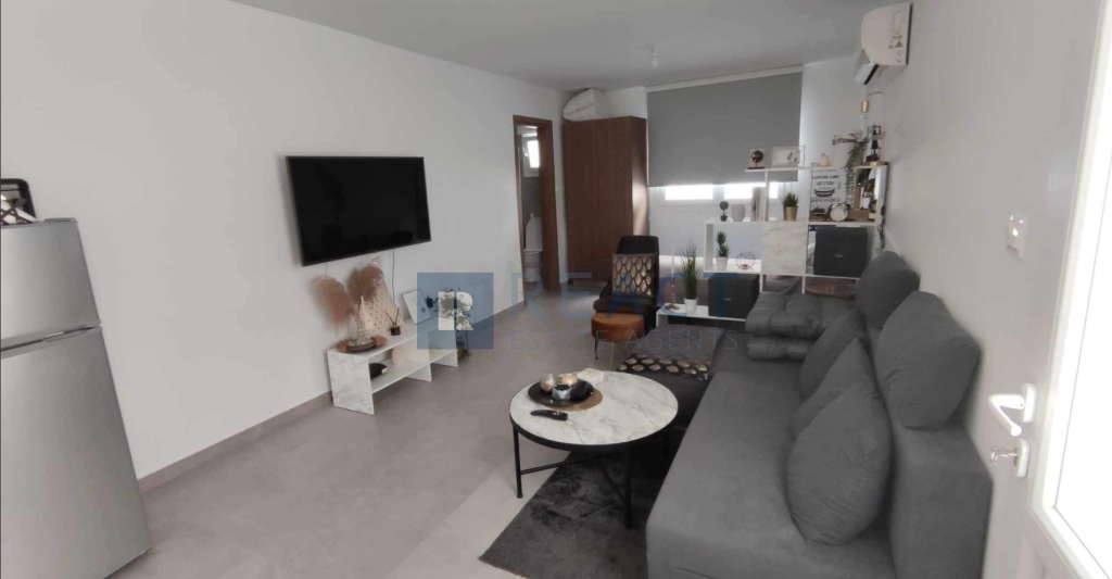 The apartment it's located on the ground floor of a residential building. It consists of one bedroom and one bathroom an open plan kitchen with dinning/living room and a balcony. The poperty it's semi-furnished with all the electrical appliances, ac and solar panel.