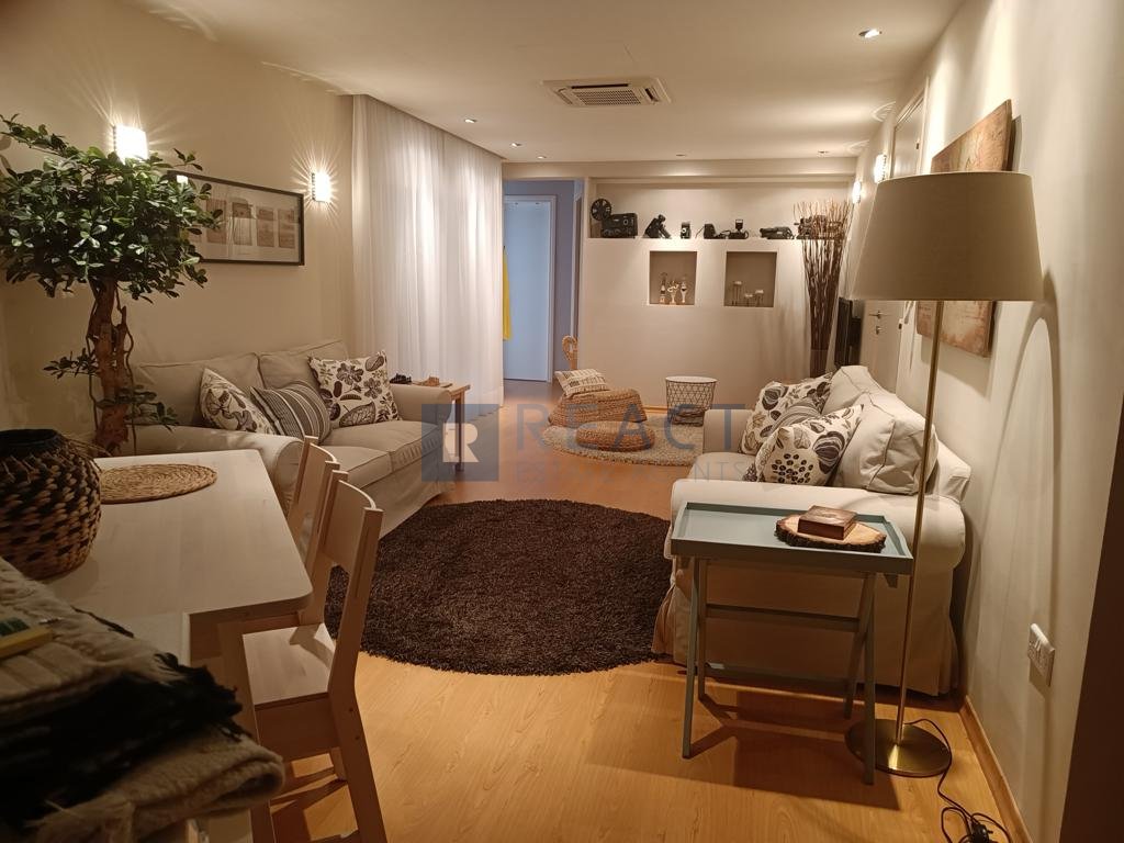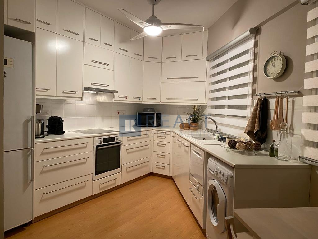 Two bedroom apartment located in Agios Pavlos, Agios Dometios. The apartment has 68sqm internal area and 17sqm covered veranda. It consists of two bedrooms, one bathroom, open plan living room and kitchen space and a veranda. The apartment is in excellent condition and it includes blinds, shutters, curtains, parquet floors, false ceilings with central A/C, hidden lighting, includes electrical appliances, covered parking and storage space. The building was constructed in 2016.