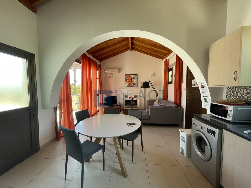 Upon stepping inside, the villa welcomes you with a generously proportioned living area that seamlessly melds with an open-plan kitchen, fostering a sense of togetherness and fluidity. The living room emanates a cozy ambiance, accentuated by a fireplace, creating a perfect backdrop for gatherings and relaxation.